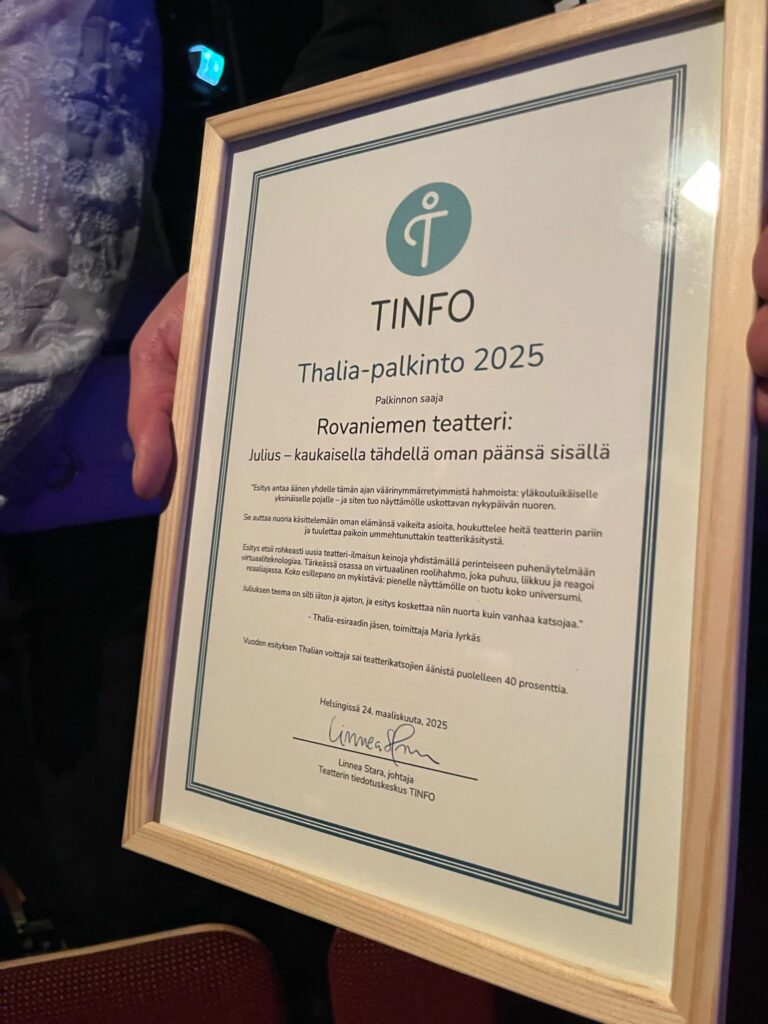 Vuoden esityksen Thalia-palkinnon 2025 on voittanut Rovaniemen Teatterin Julius – kaukaisella tähdellä oman päänsä sisällä. Teatterin tiedotuskeskus TINFO jakoi tunnustuspalkinnon esityksen työryhmälle esittävän taiteen alan yhteisessä Thalia-juhlassa.